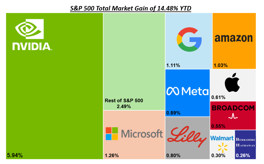 The S&P 500 advanced another 4.32% this quarter, bringing its year-to-date gain to 14.48%. The ongoing enthusiasm for AI continues to fuel momentum, leading to premium valuations for select companies with compelling AI narratives. As the fascination with AI intensifies, financial markets suggest a perceived lack of future competition in the space, with mega-cap technology companies driving overall market returns (See Chart).
